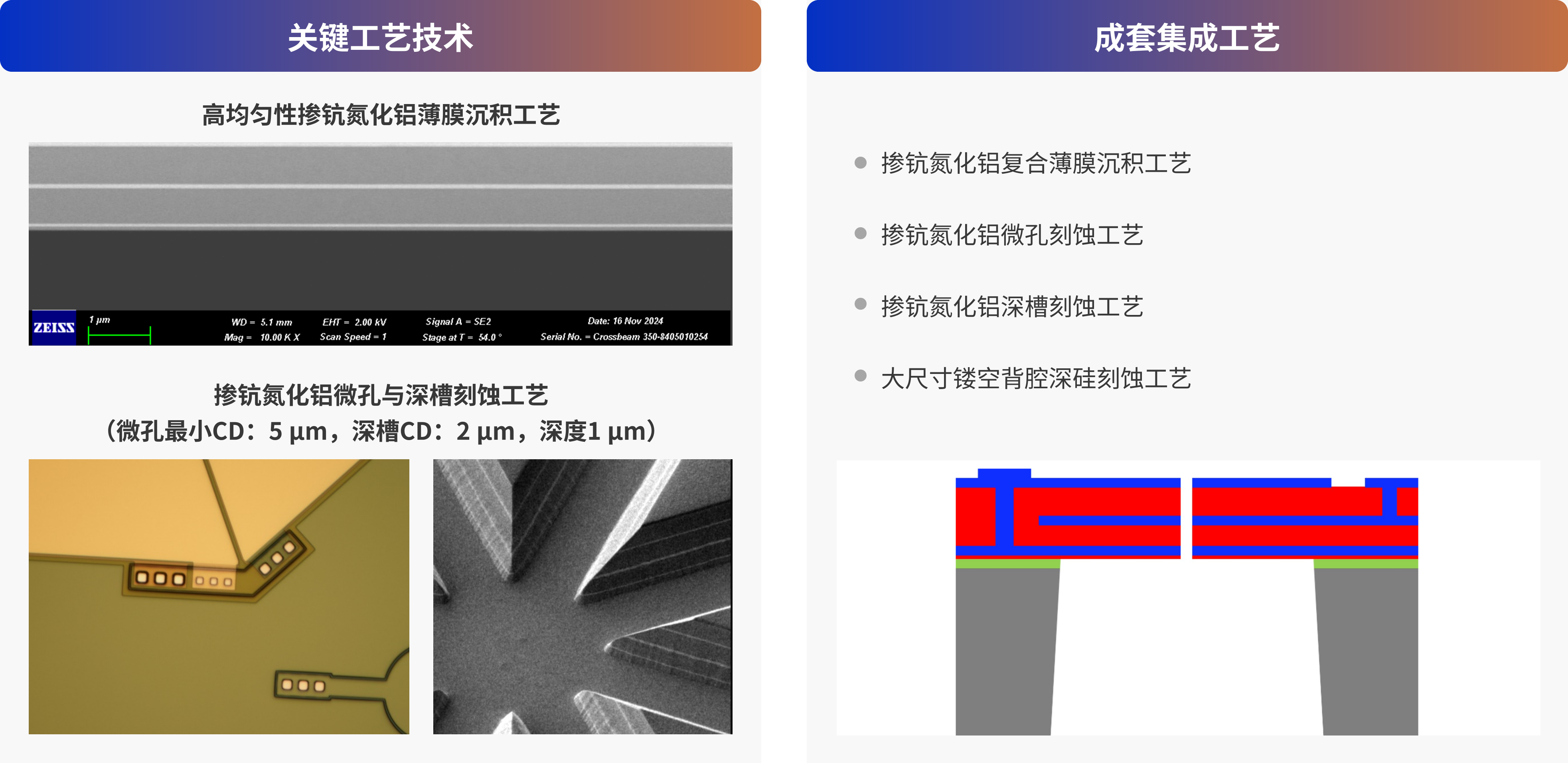 突破高均匀性掺钪氮化铝薄膜沉积、图形化,微孔与深槽刻蚀结构等关键工艺技术